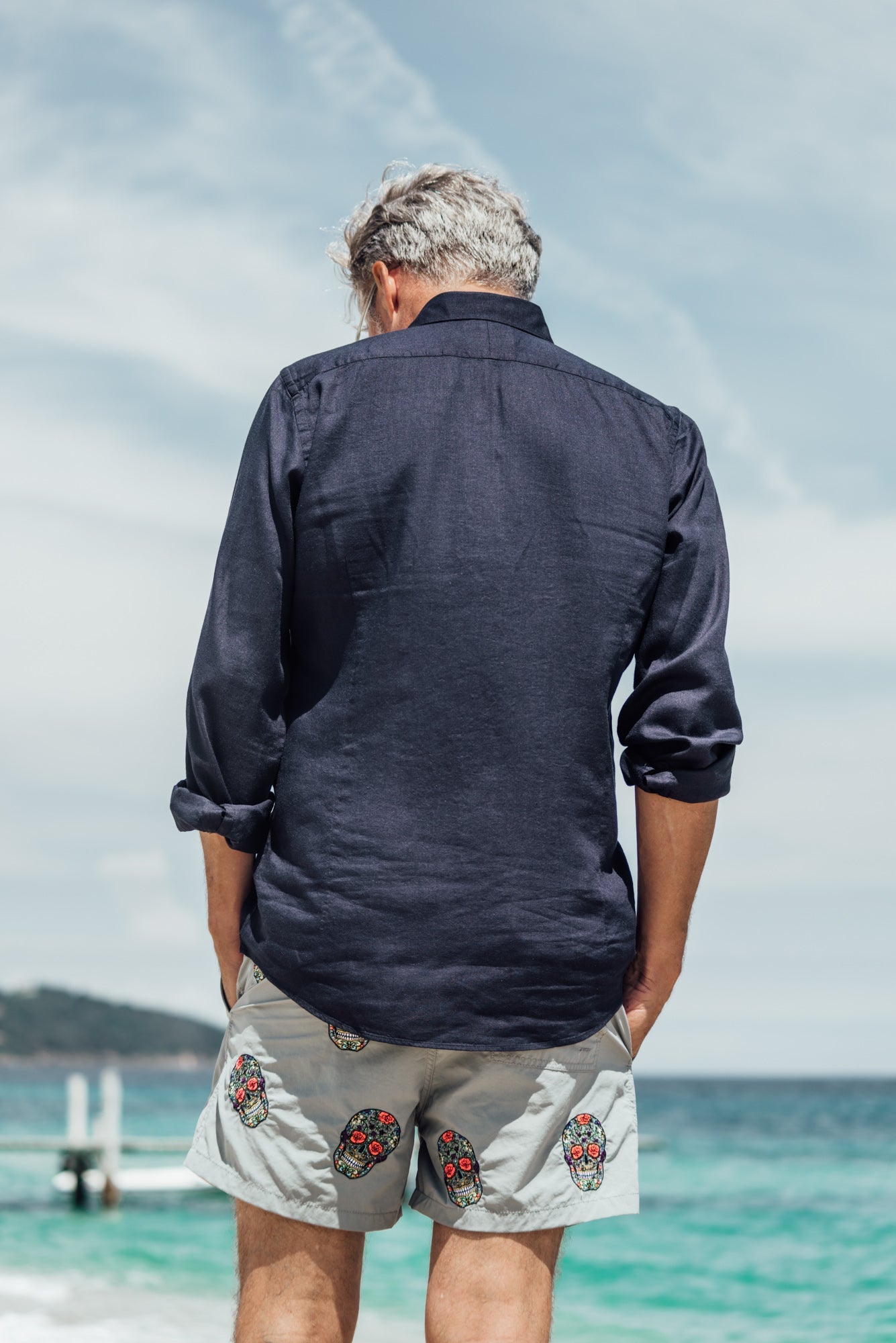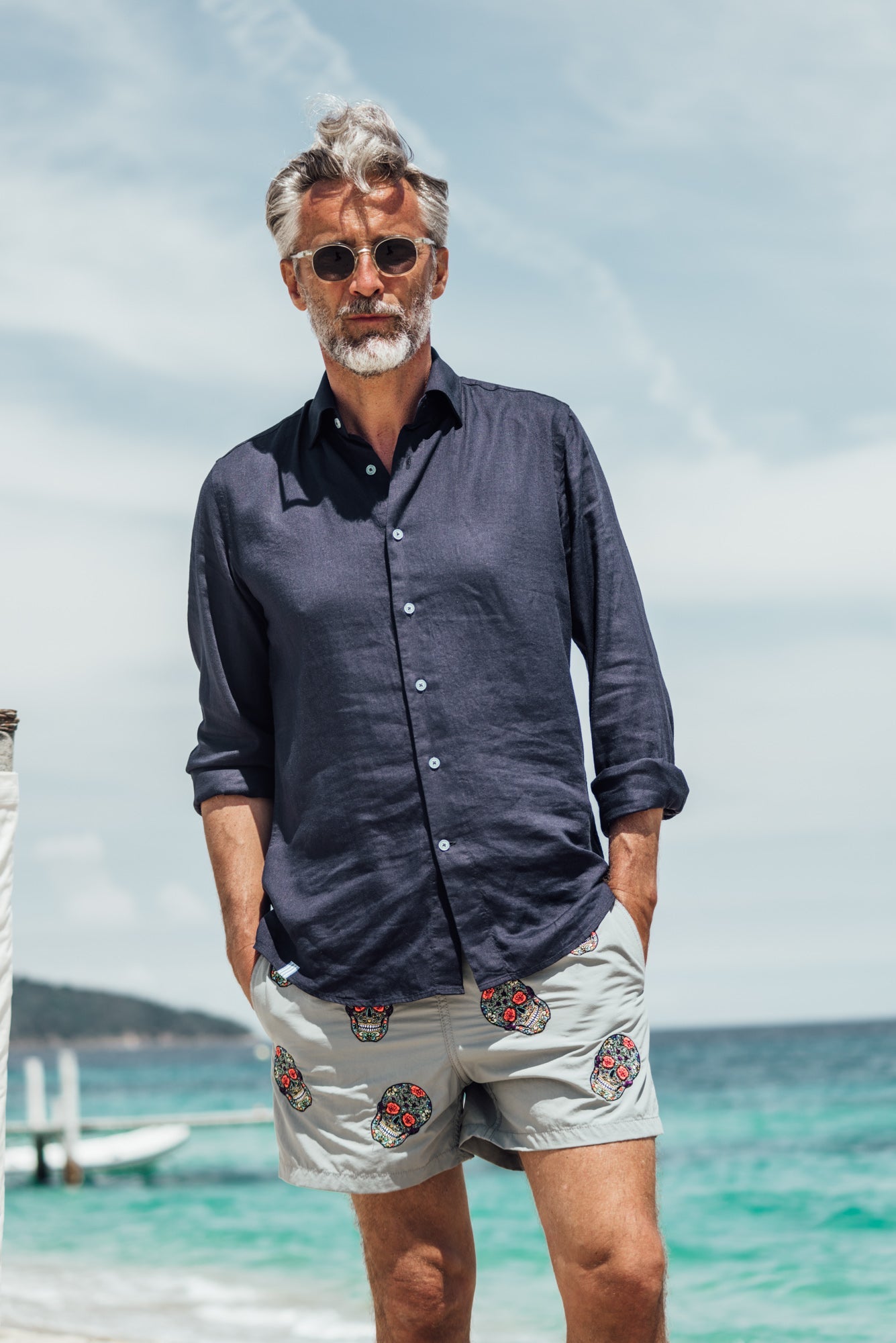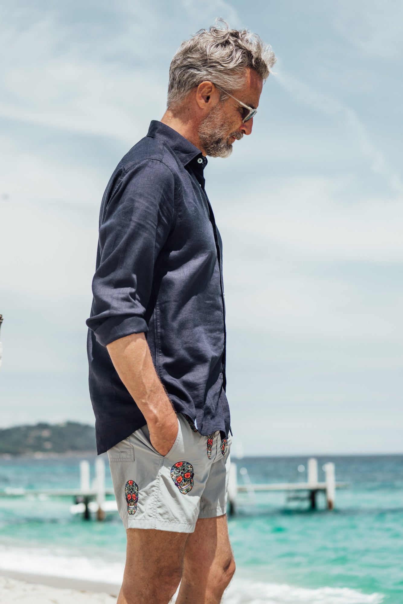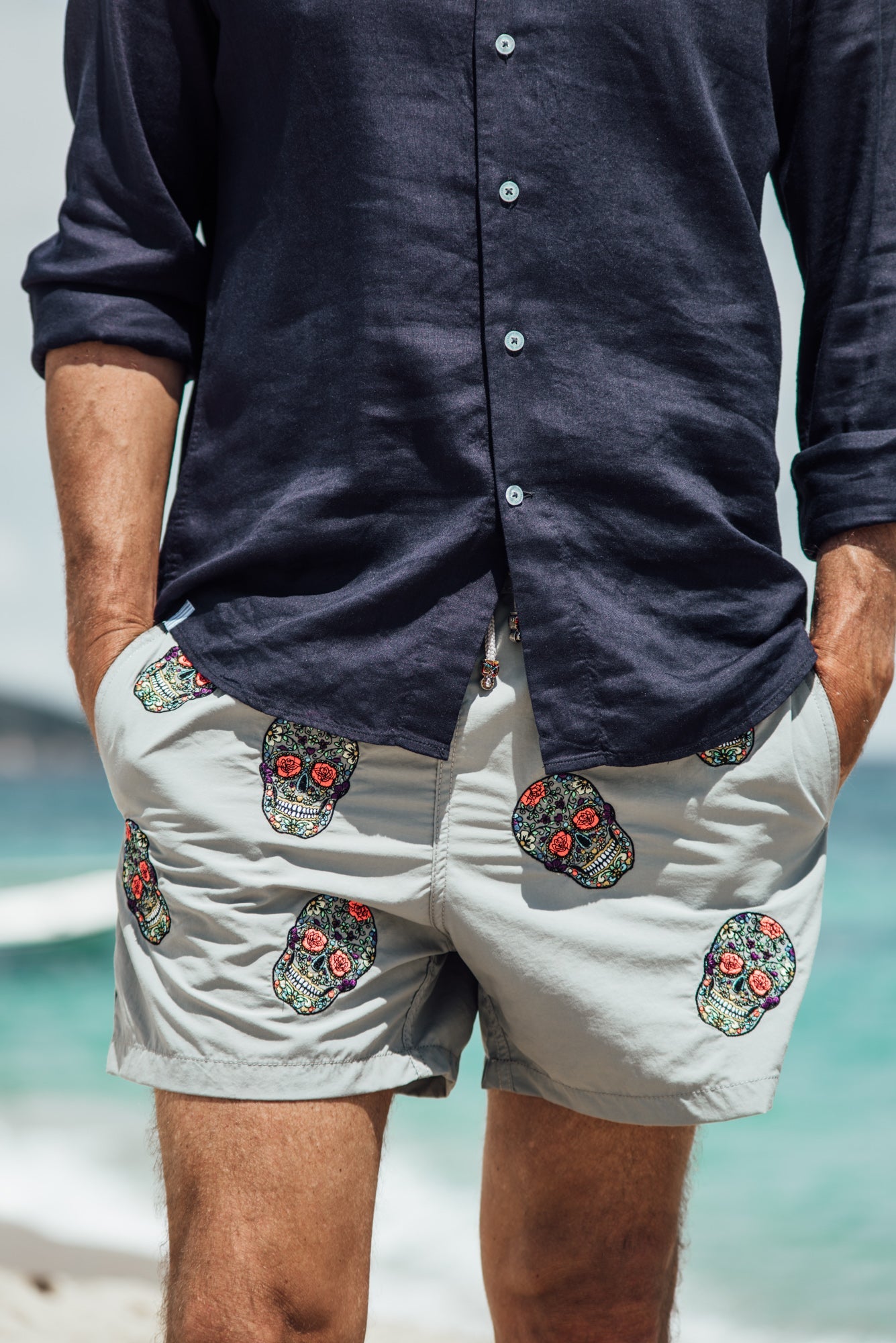 Maillot de bain homme avec des têtes mexicaines brodées sur toute la pièce.