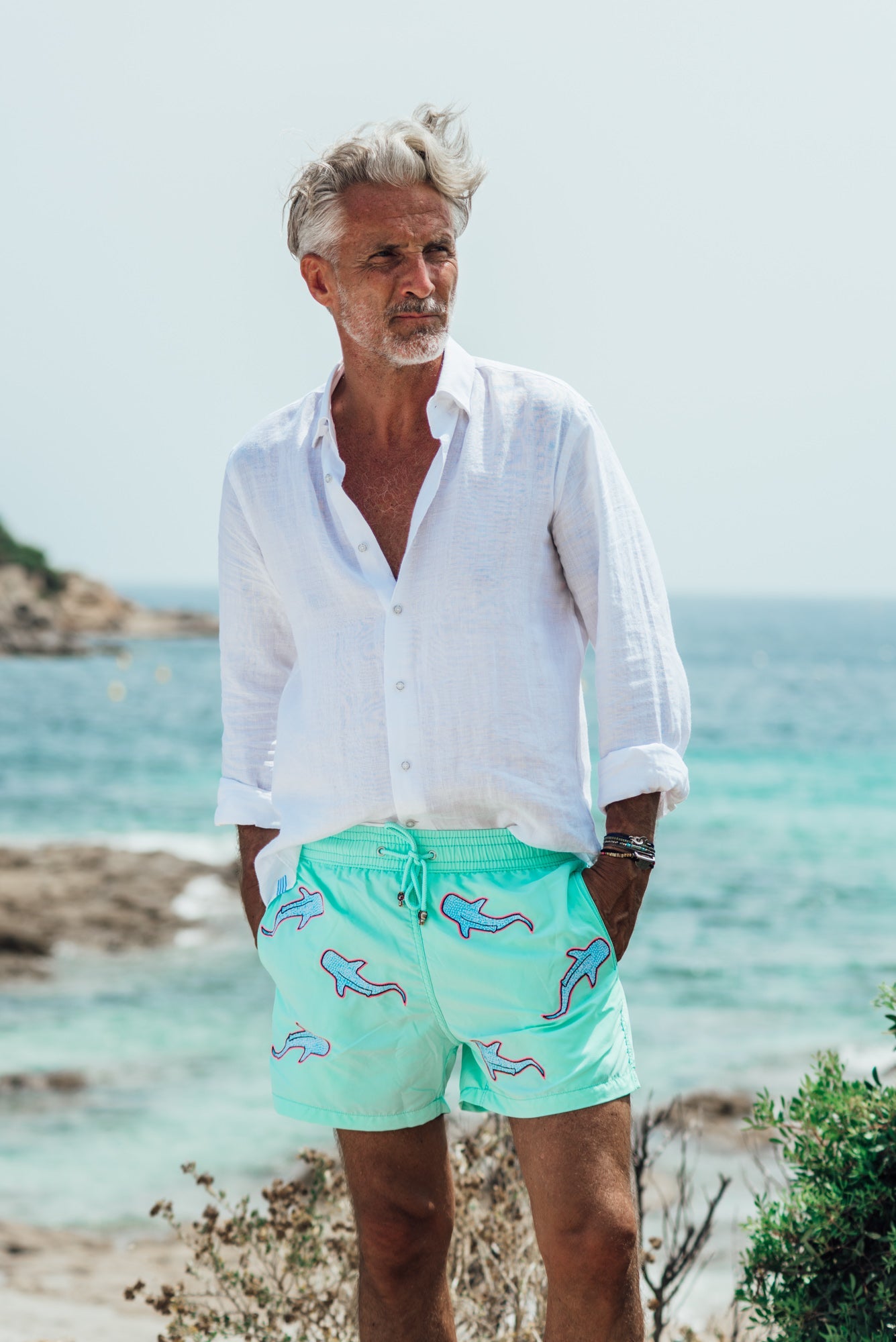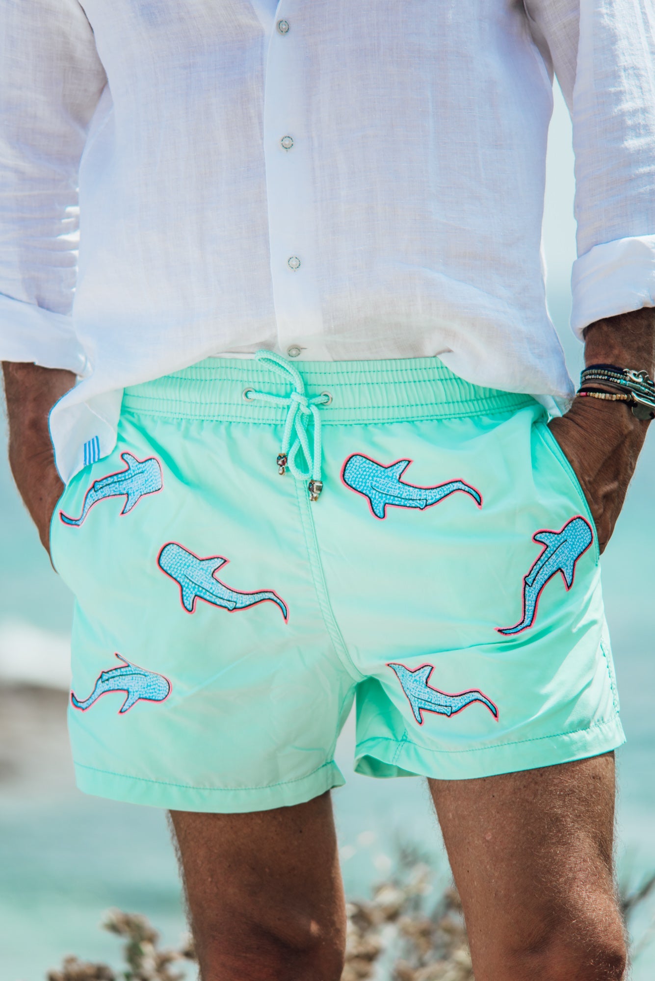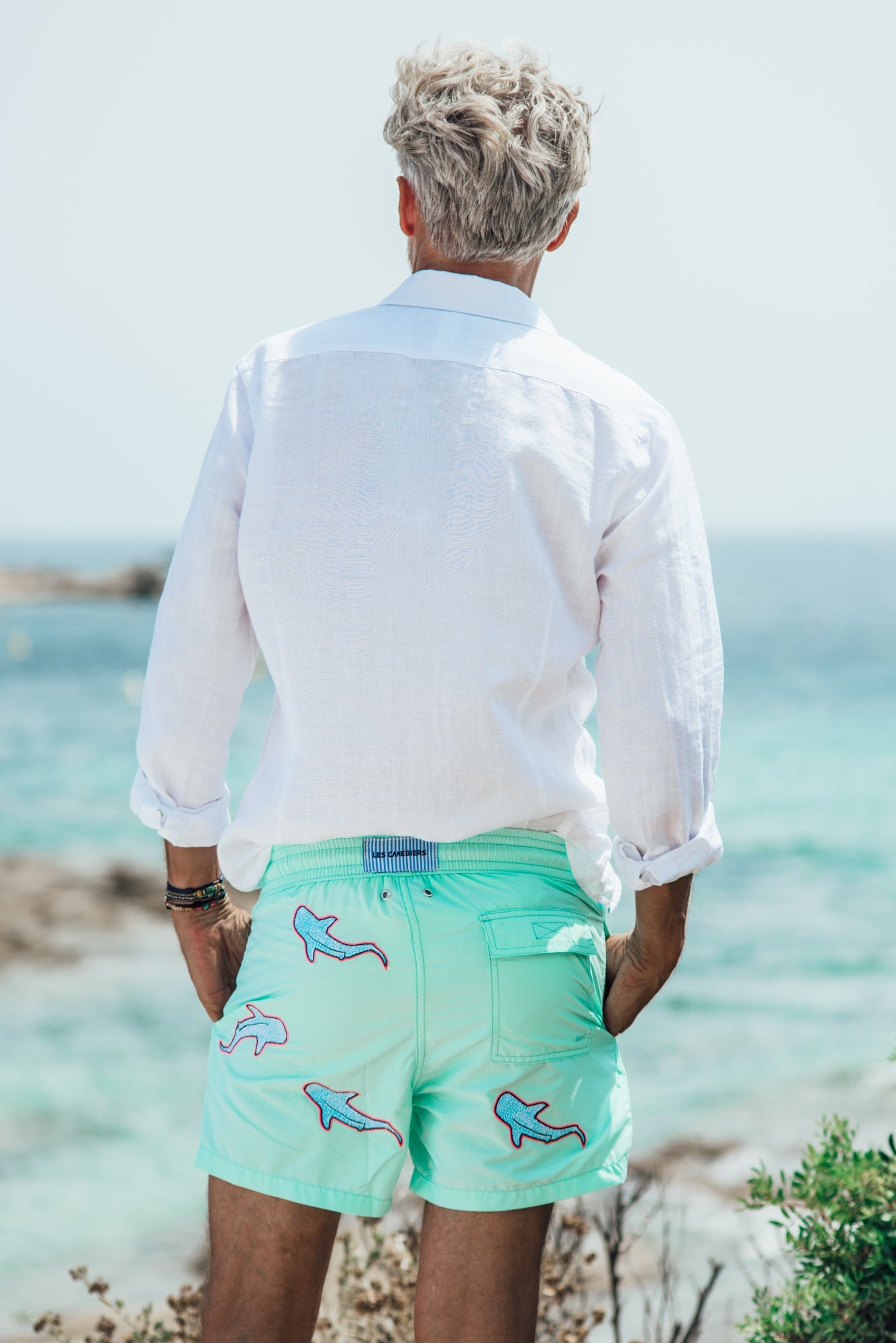 Maillot de bain homme brodé d'une tête mexicaine. Maillot de bain homme avec broderies de requins sur toute la pièce.