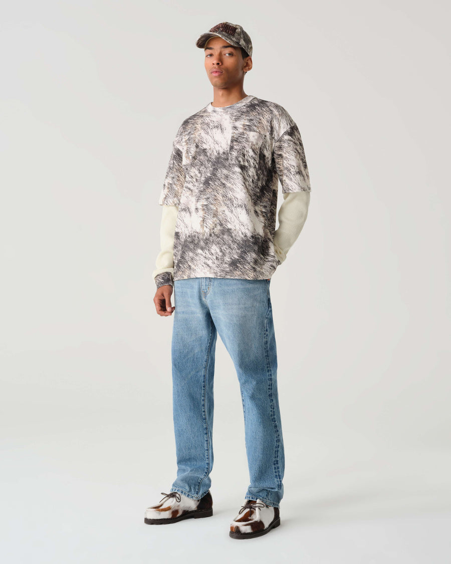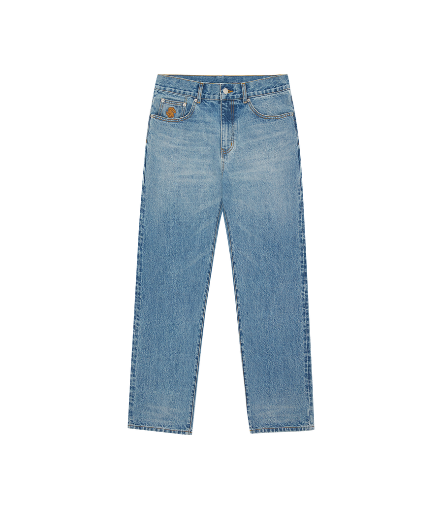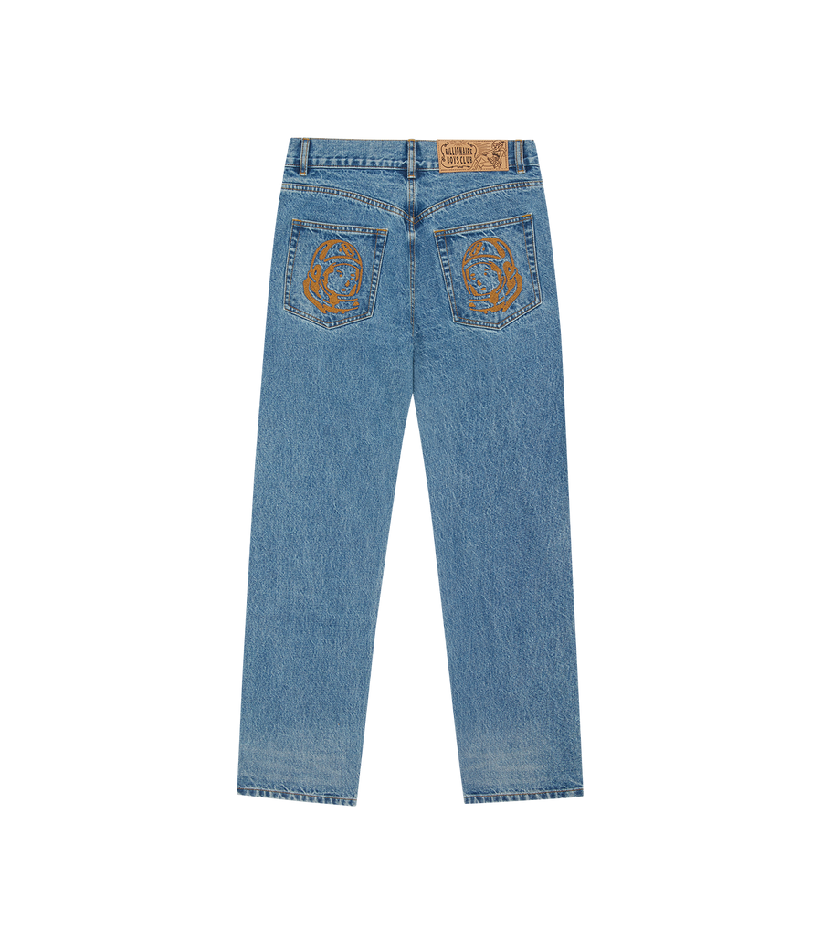 Billionaire Boys Club Printemps '25 - Pantalon en denim Astro en indigo présentant les casques Astro brodés sur les poches arrière et le signe dollar sur la poche à monnaie.