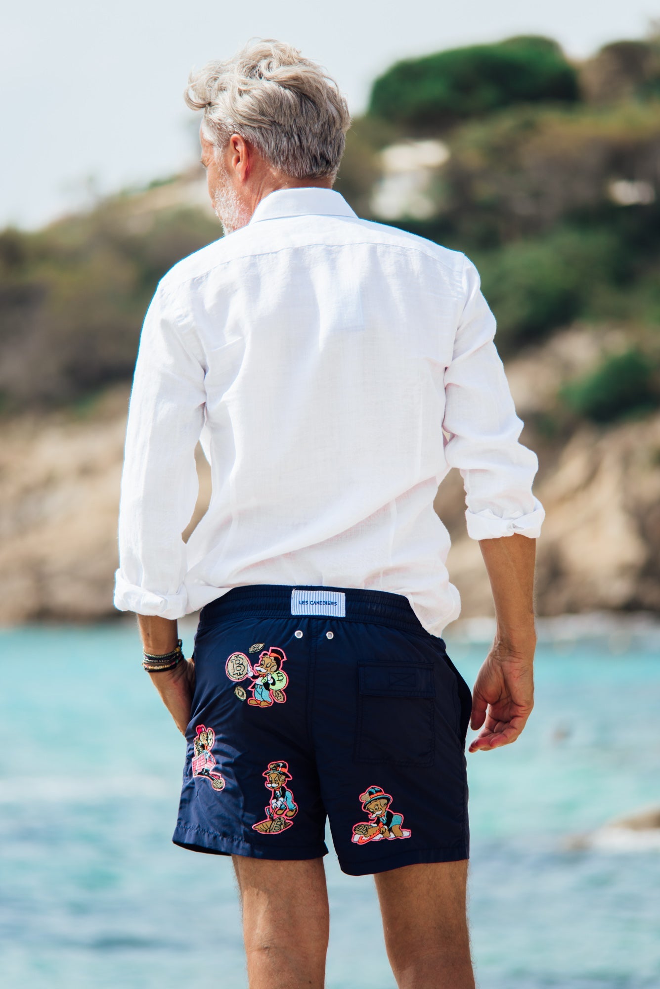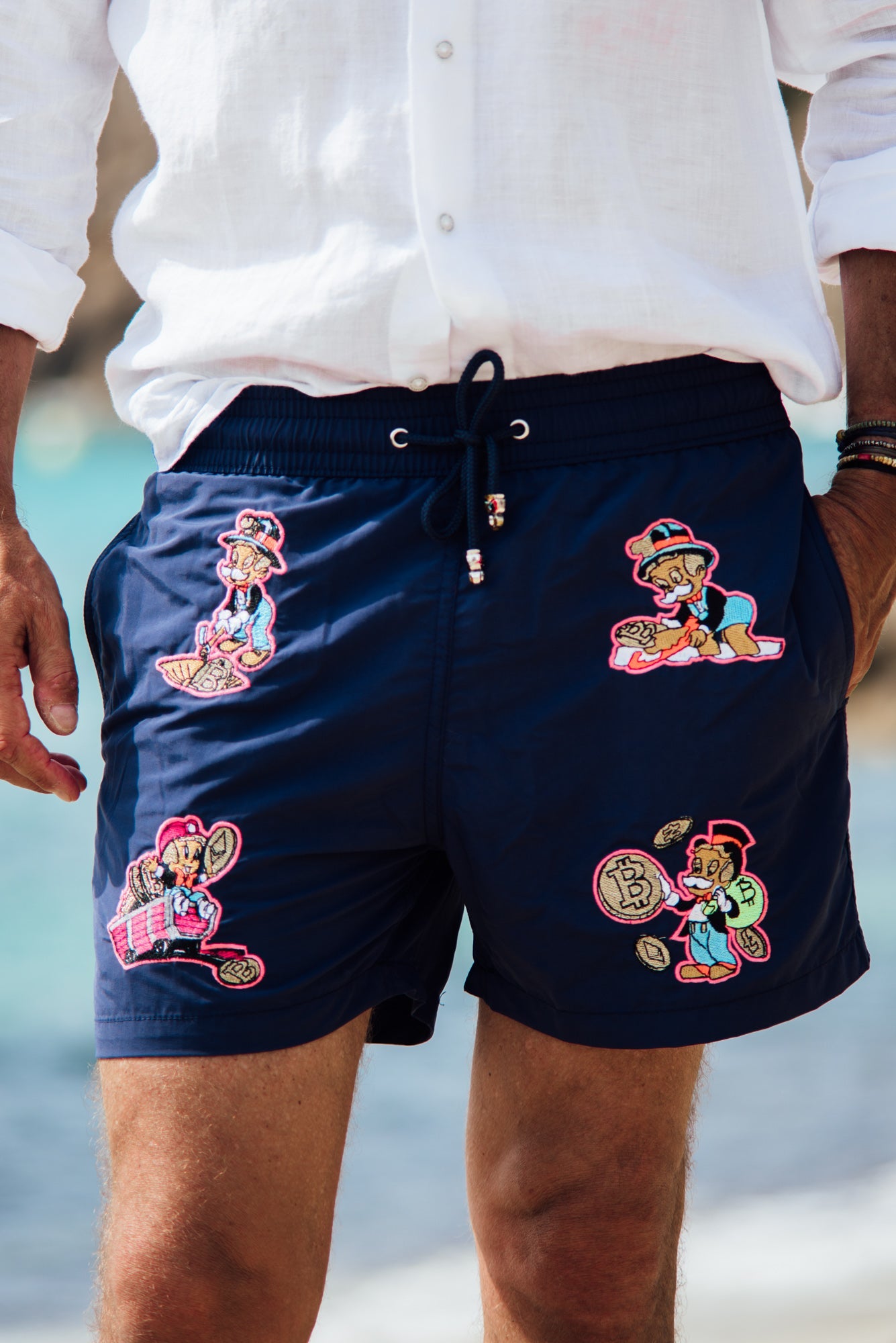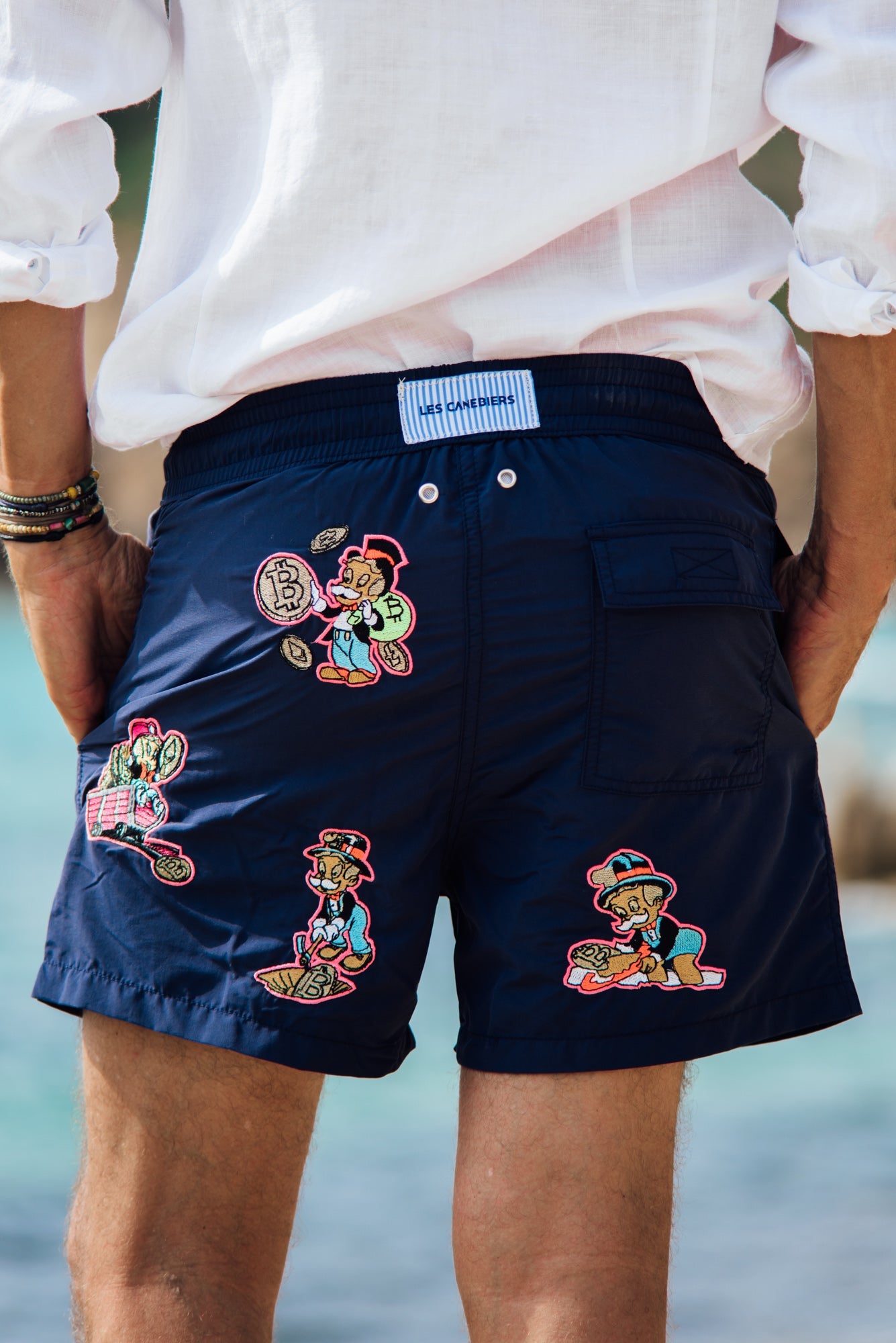 Maillot de bain pour homme avec broderies bitcoin sur toute la pièce.