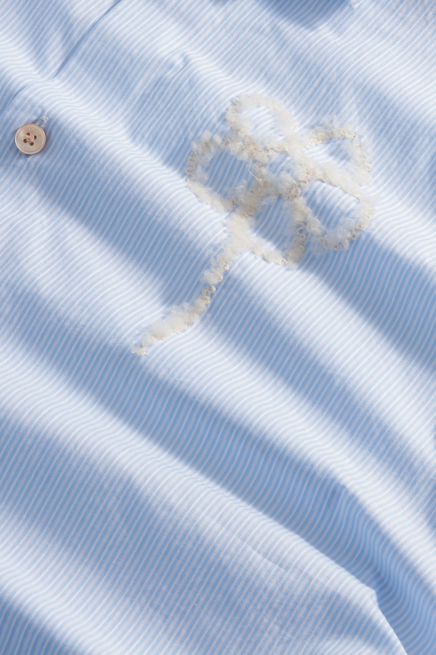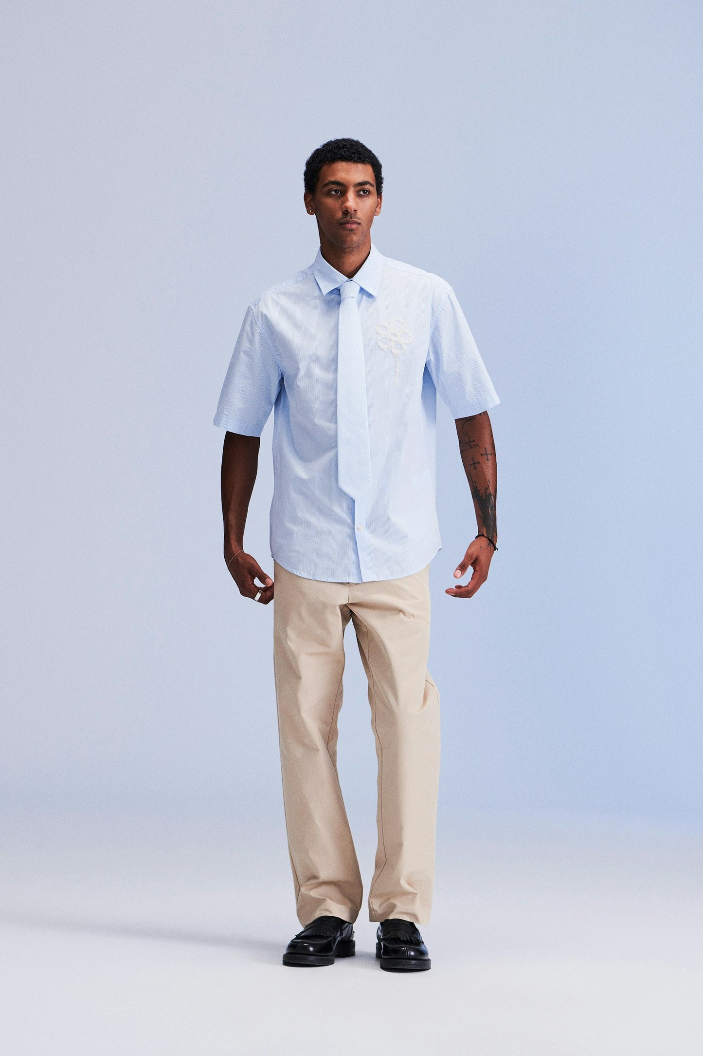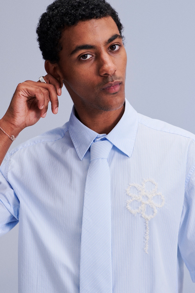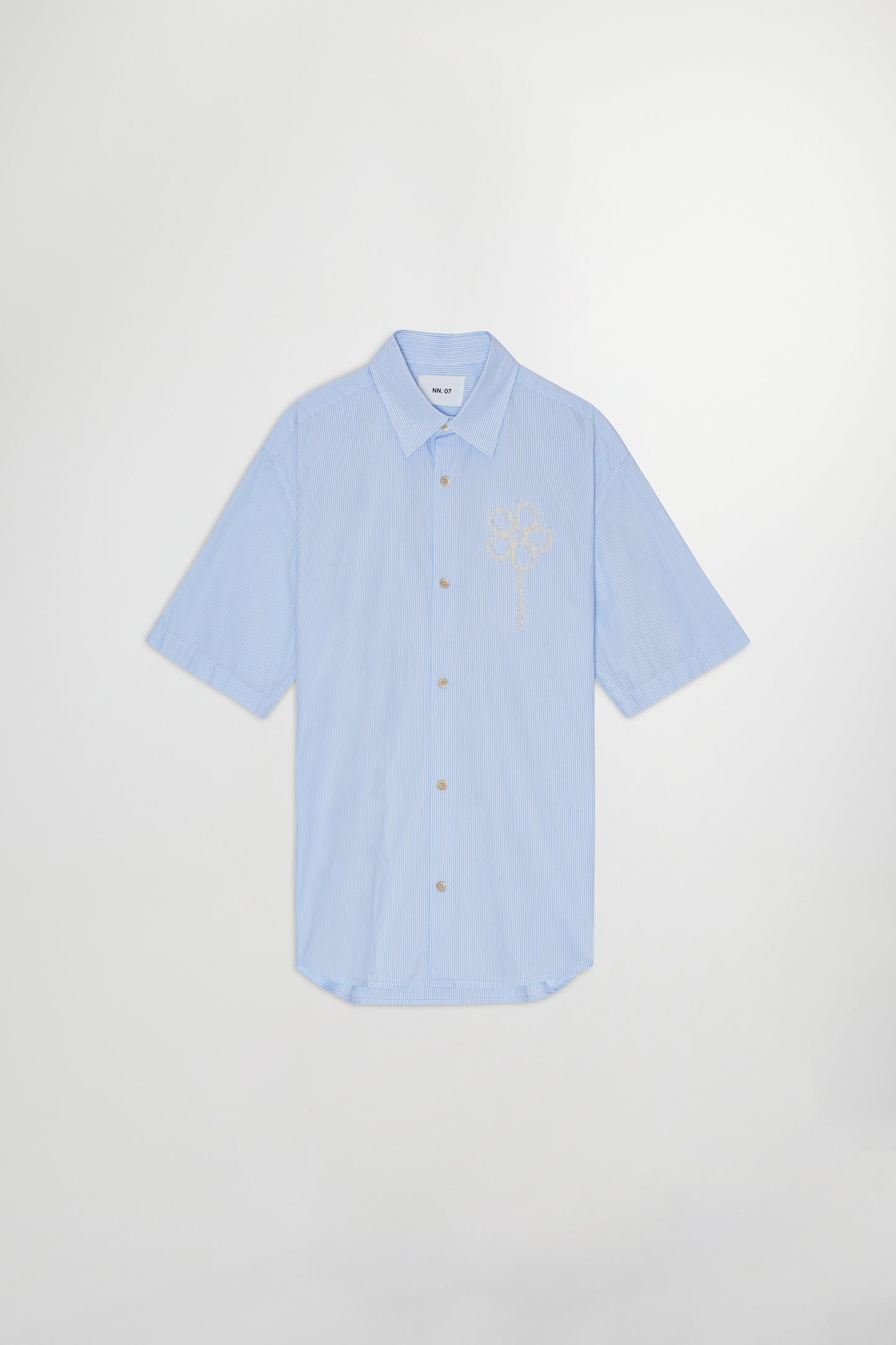 Button-down shirt in crisp organic cotton, topped with mother-of-pearl buttons engraved with the NN.07 logo and looped flower embroidery on the chest.