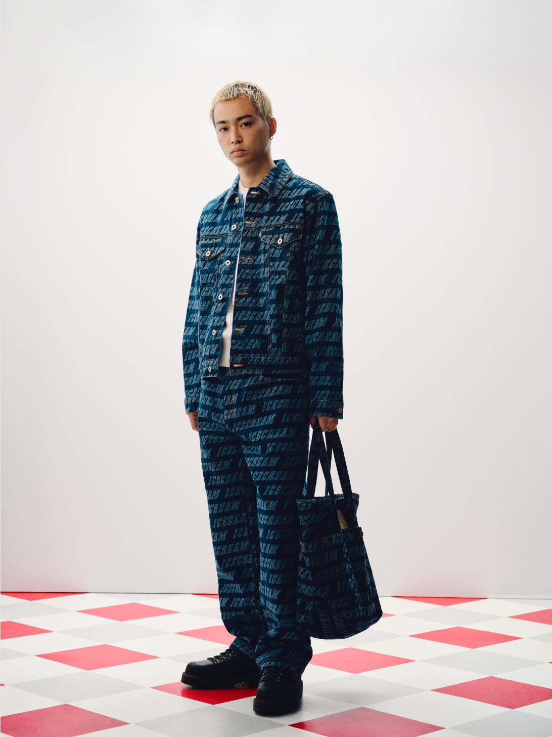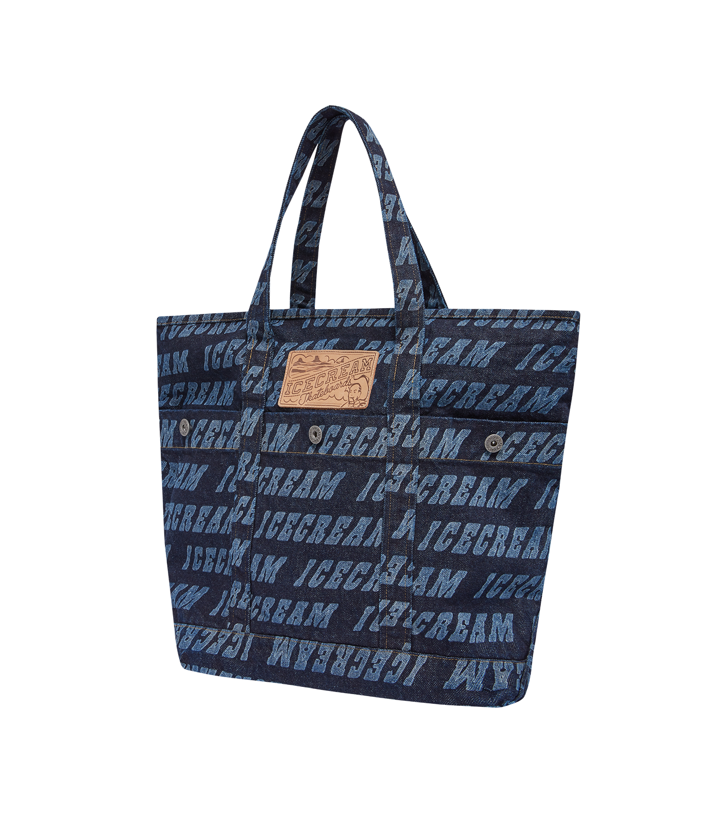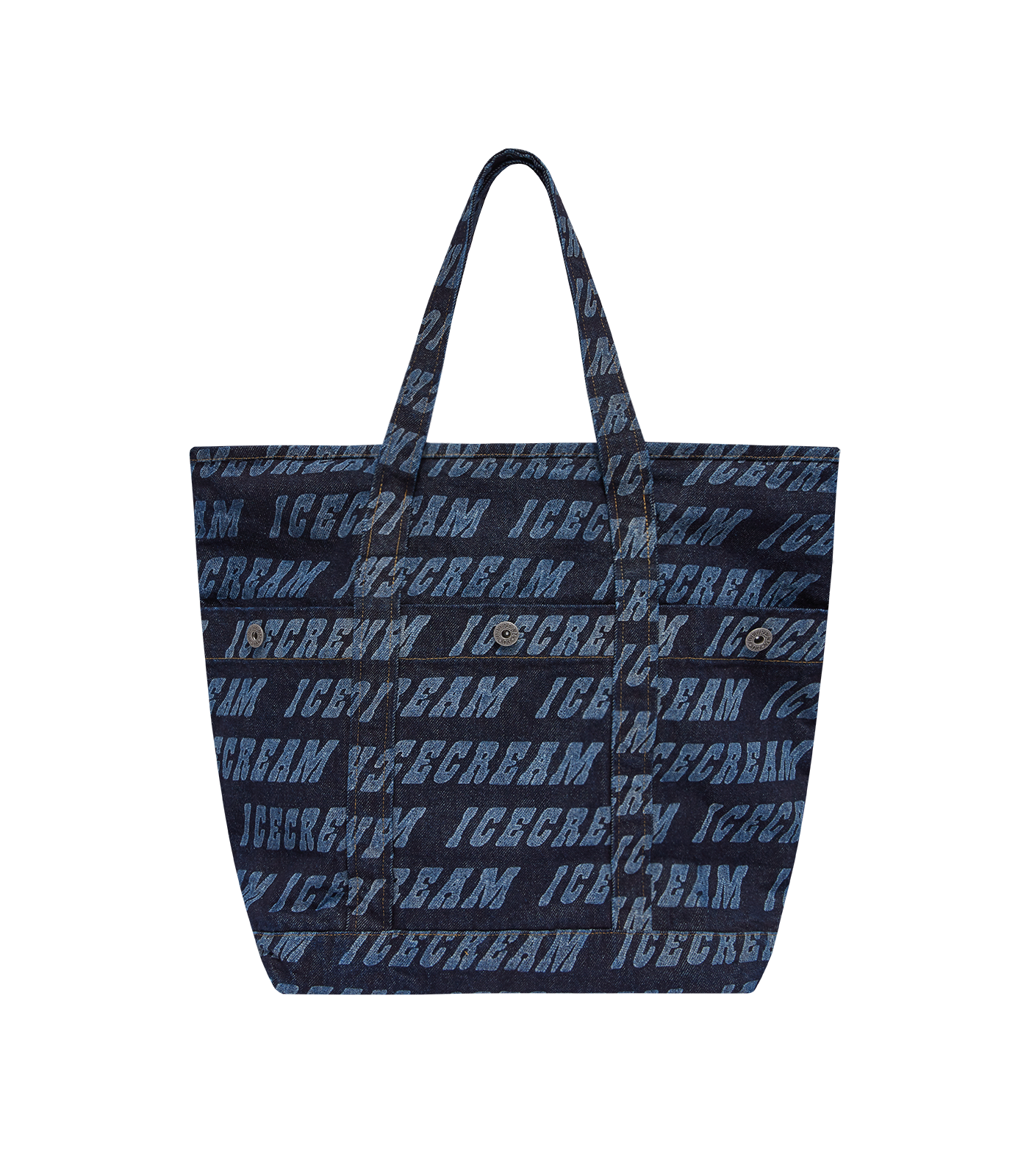 ICECREAM Pré-Automne 2025 – Le tote bag en denim à logo répété arbore un motif intégral du logo ICECREAM ainsi qu'une étiquette de marque sur le devant.