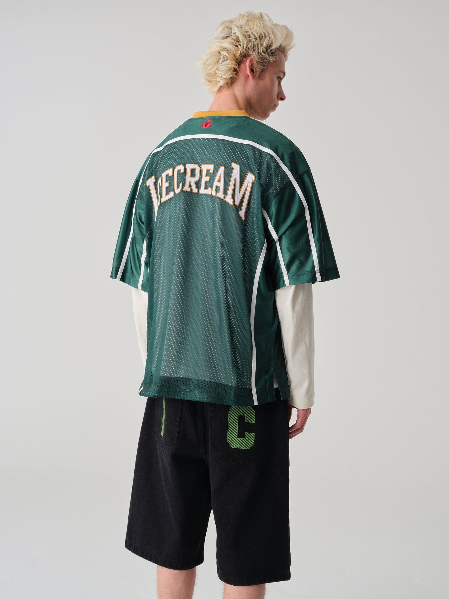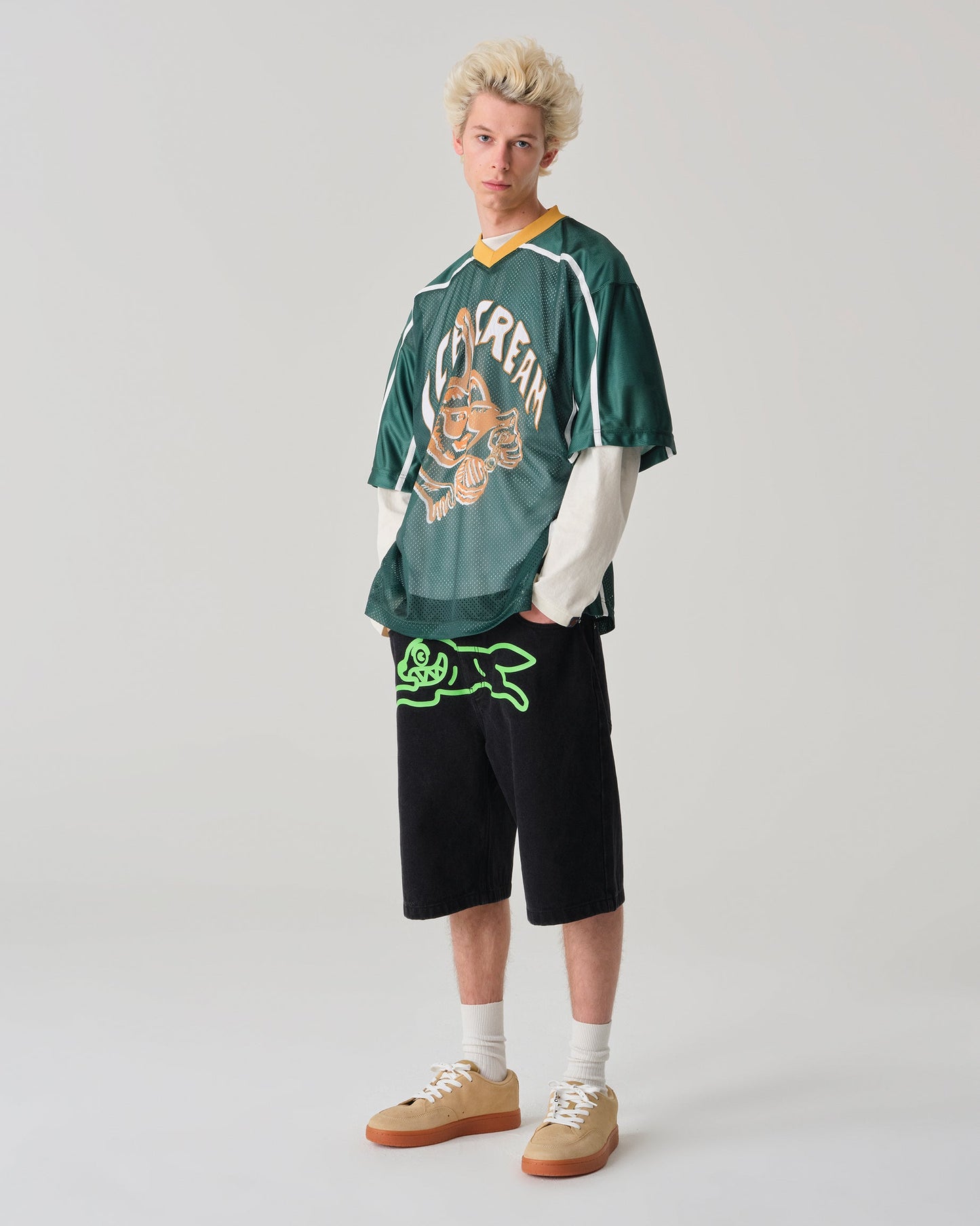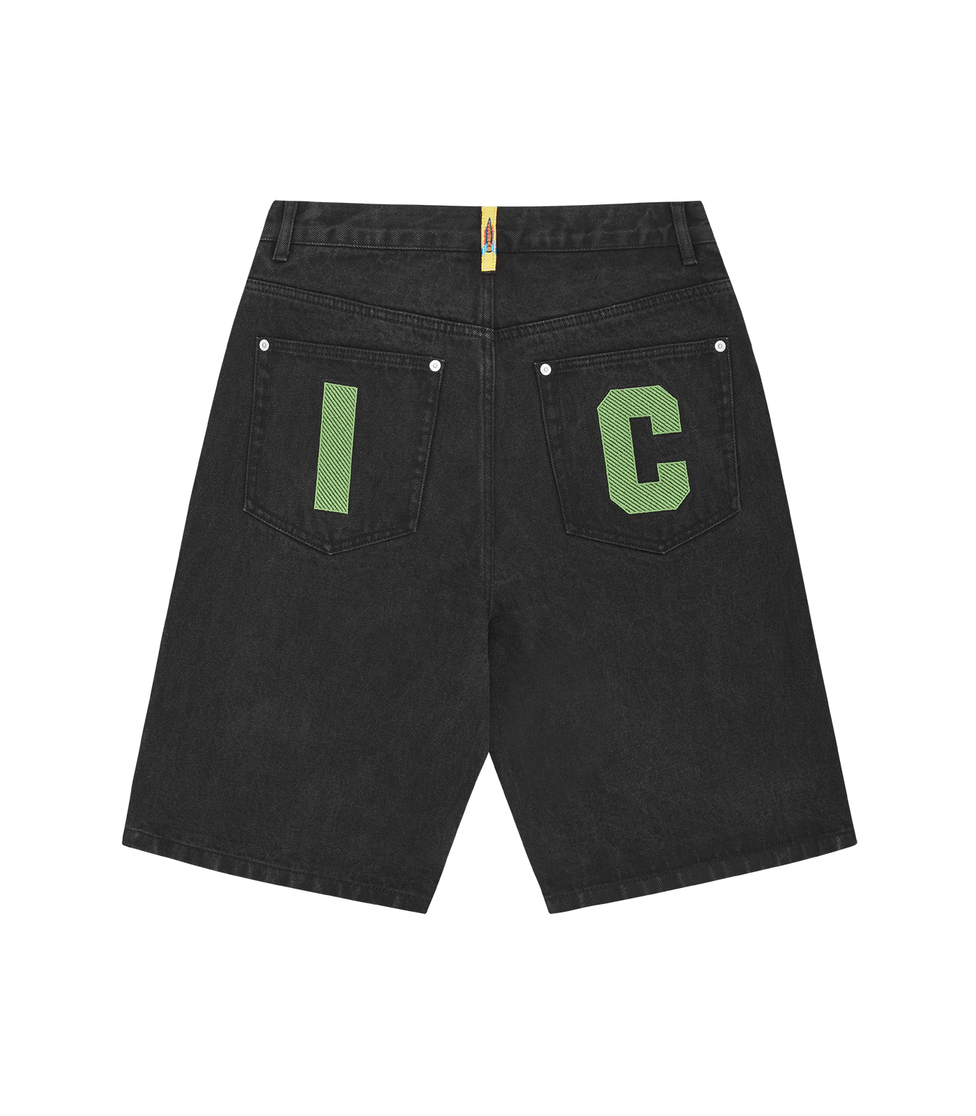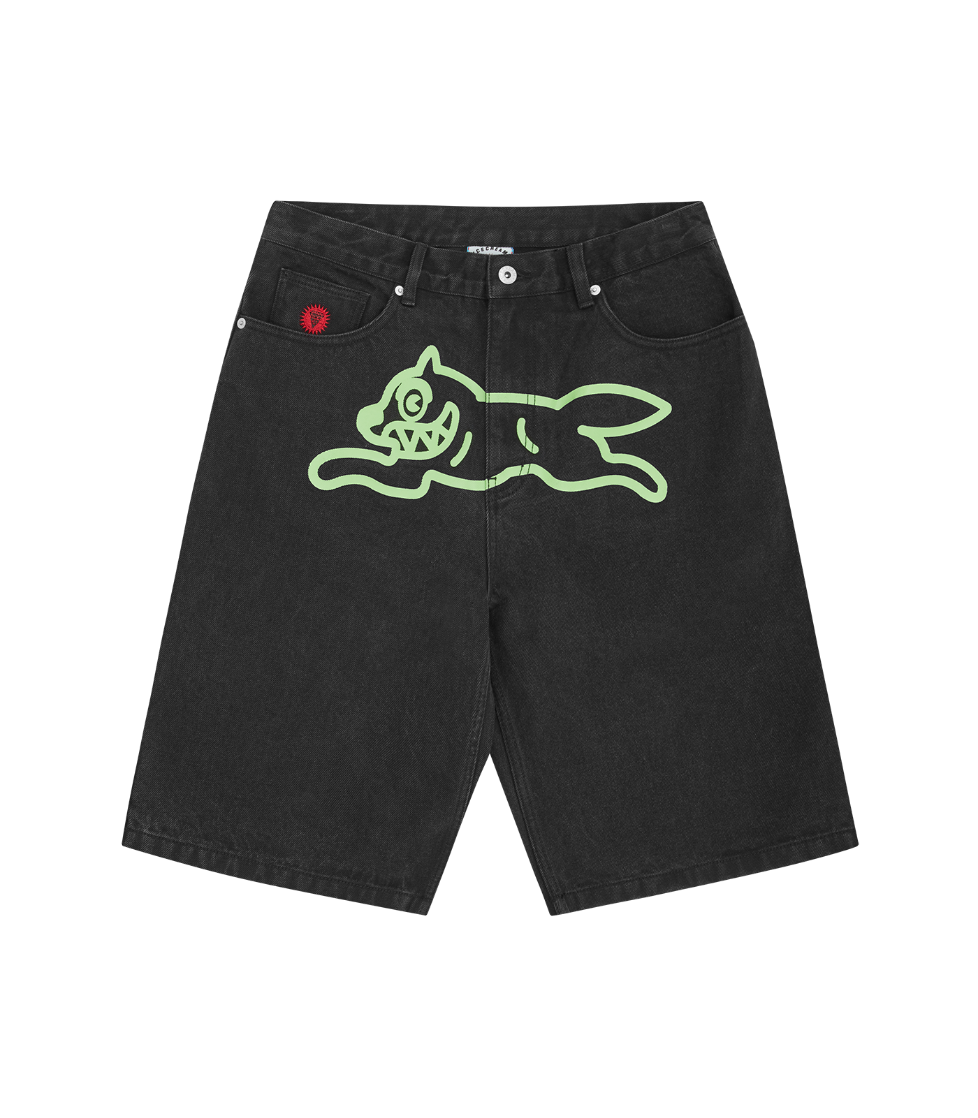 ICECREAM Printemps '25 - Short en jean Running Dog, avec l'emblématique motif de chien courant sérigraphié sur le devant, le signe IC brodé, le lettrage « IC » brodé sur les poches arrière et une braguette zippée.