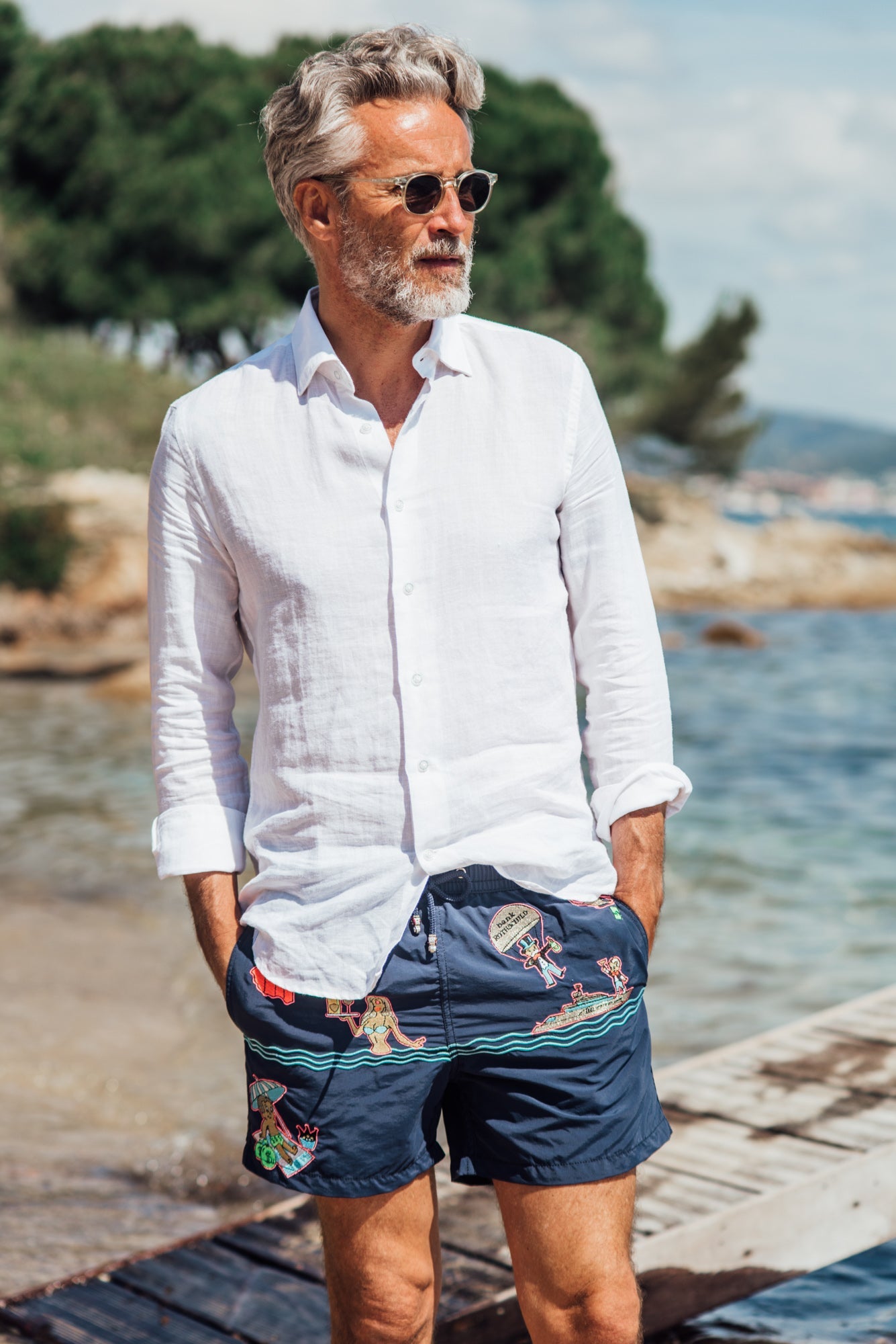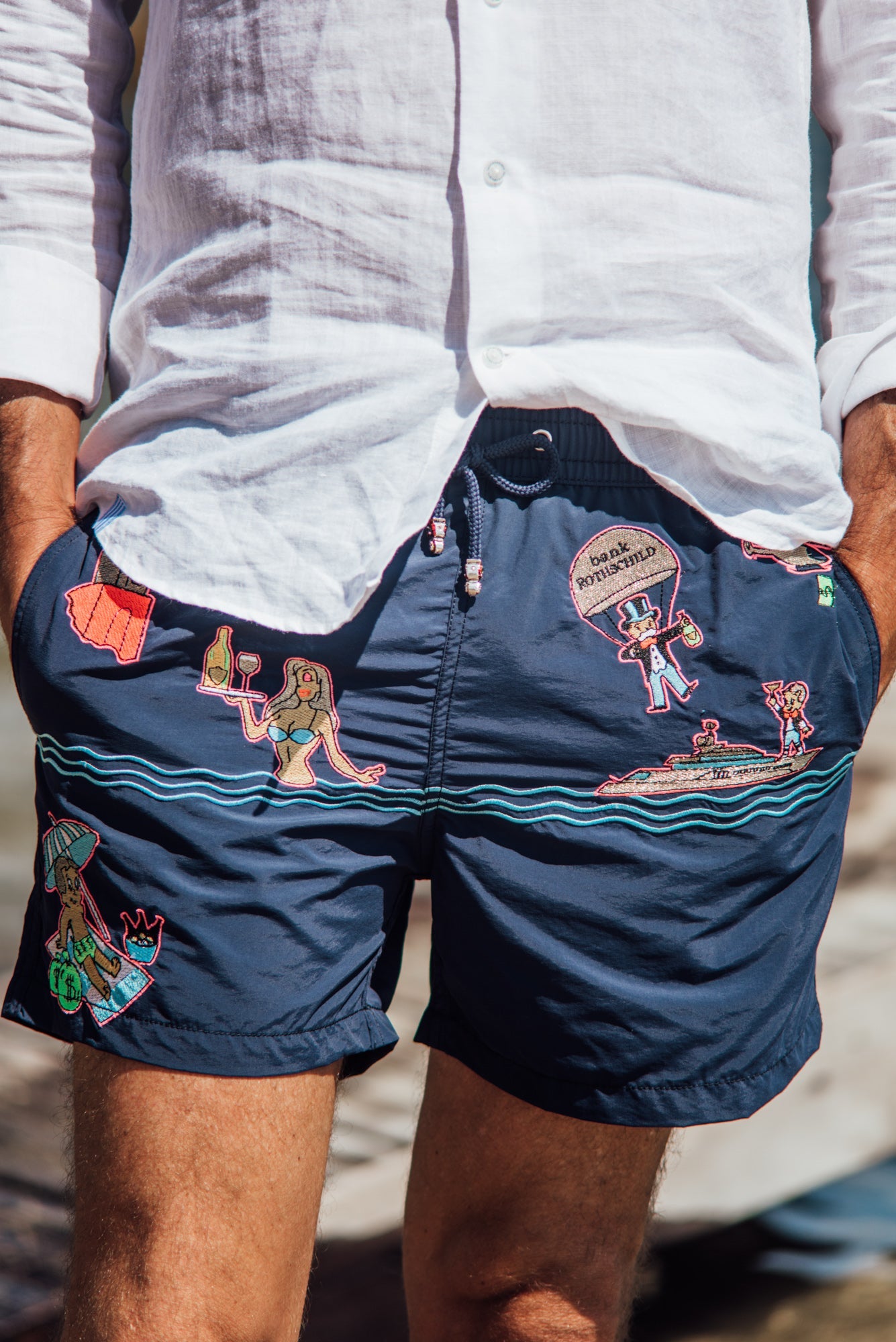 Maillot de bain homme brodé d'instants du village de Saint-Tropez sur toute la pièce.