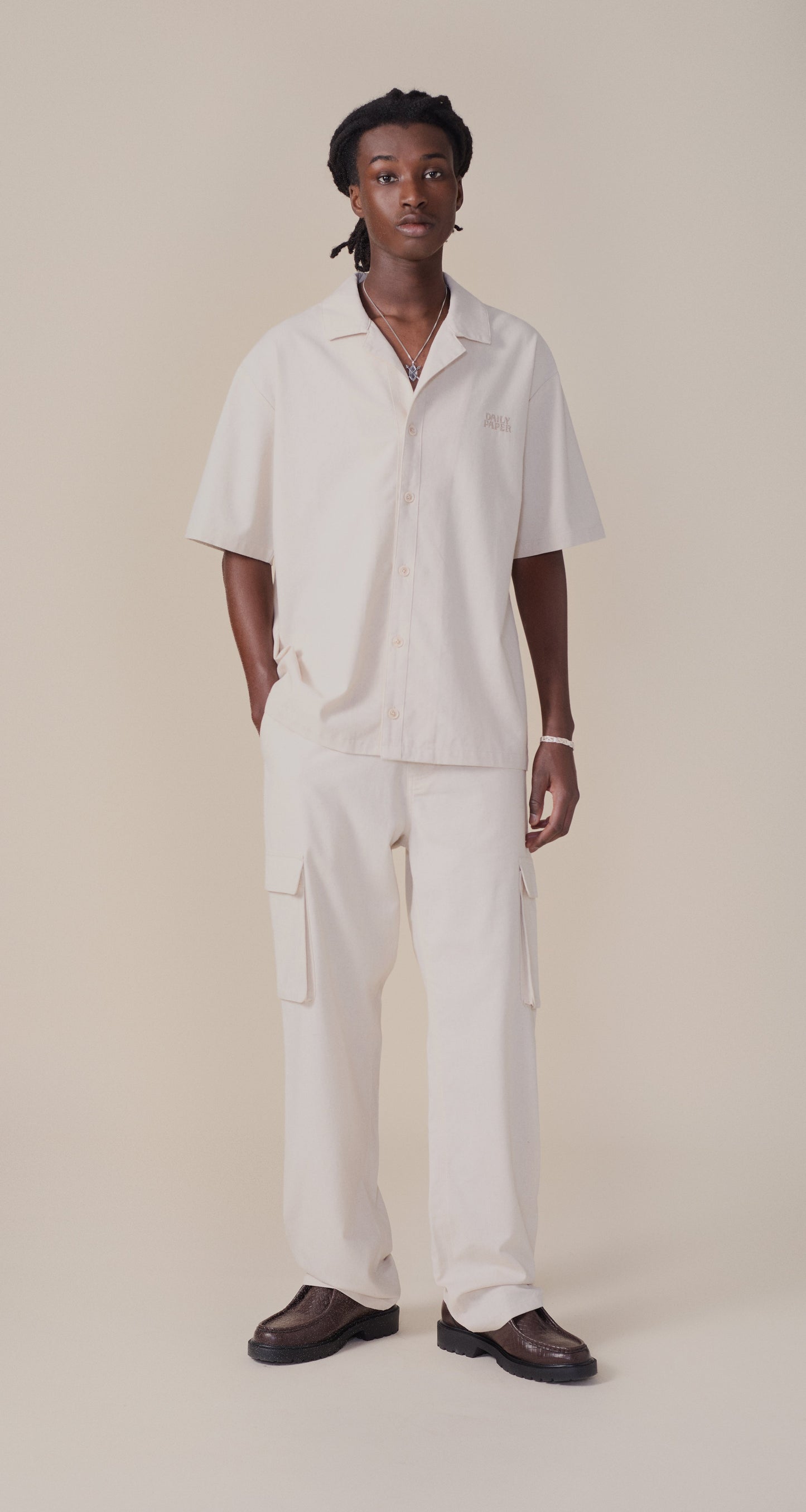 Cette silhouette décontractée à manches courtes est fabriquée en tissu lin-viscose respirant. La chemise présente une patte de boutonnage avec une fermeture à boutons visibles, un col de chemise classique avec un revers et un empiècement au dos. Un point de chaînette de type R brodé décore la poitrine.