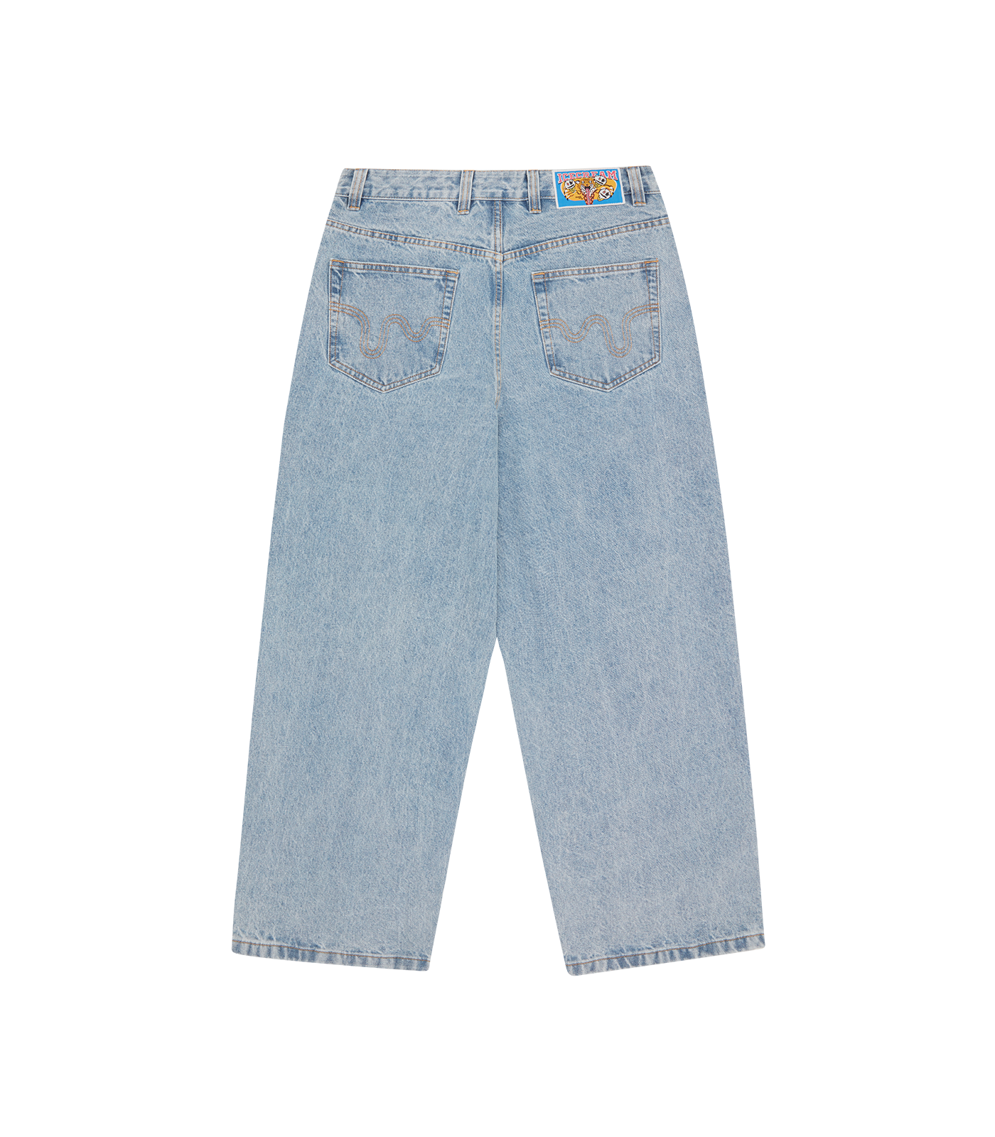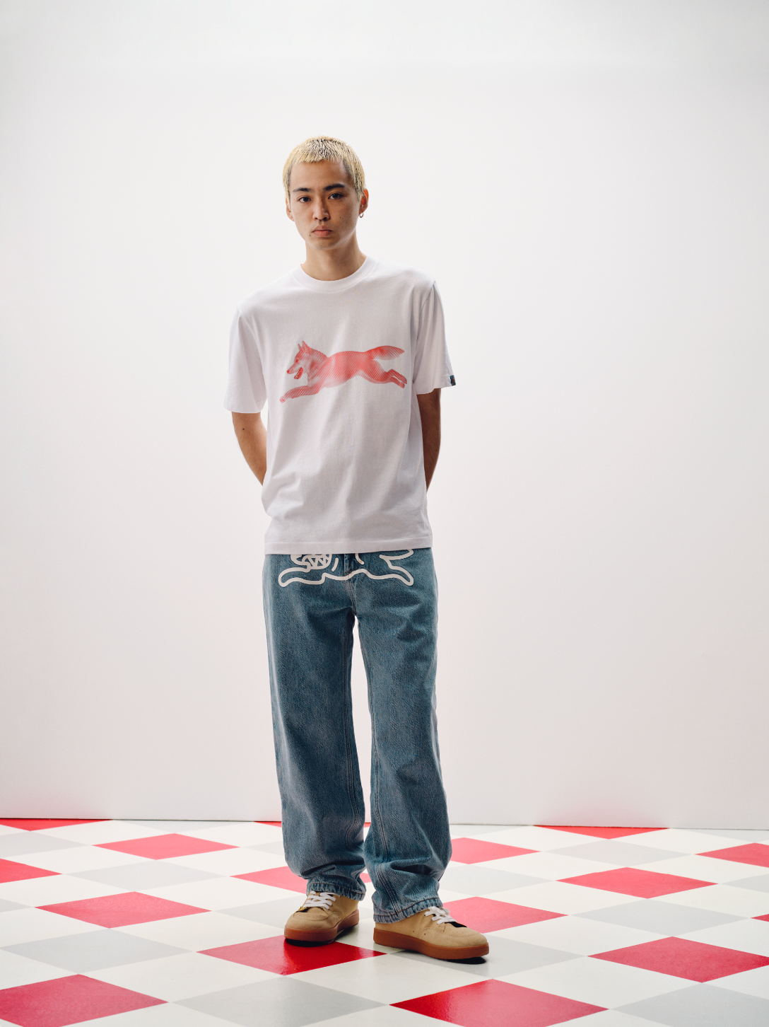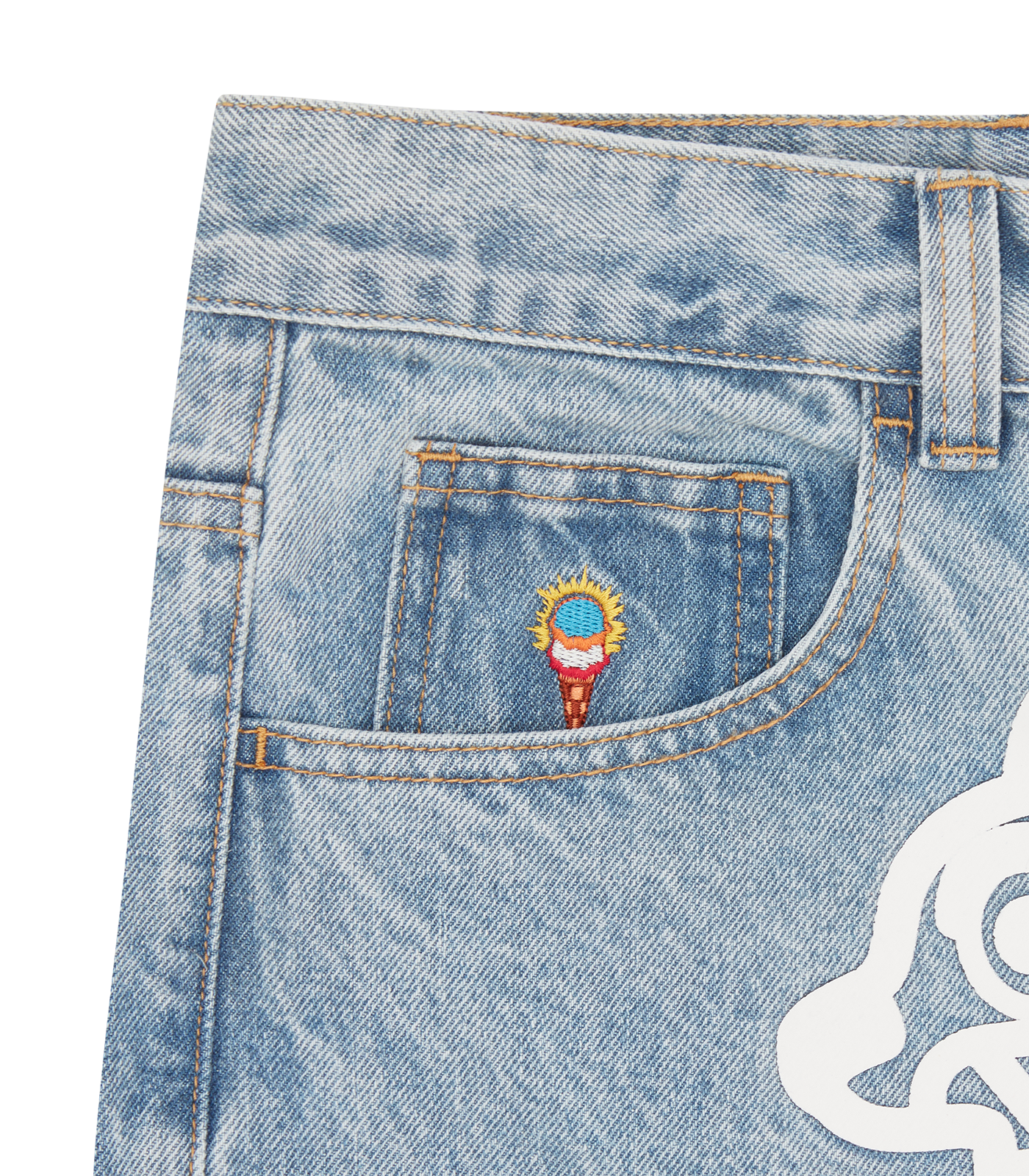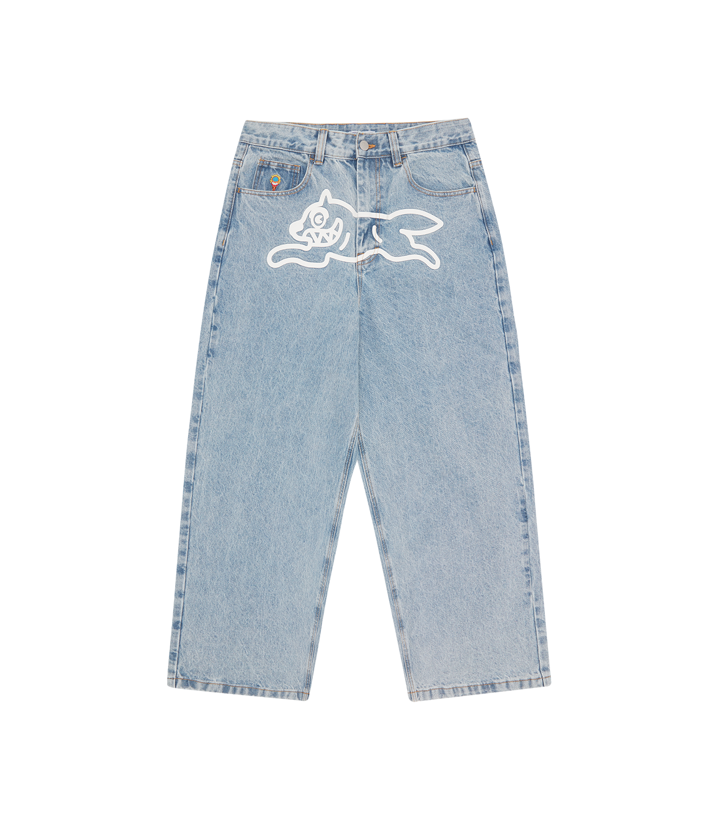 ICECREAM Spring '25 - Running Dog Triple Scoop Denim Pants, feature a screen-printed running dog graphic on the front, embroidered double scoop signet and drip detailing on the back pockets, and a zip-fastened fly. Baggy fit.